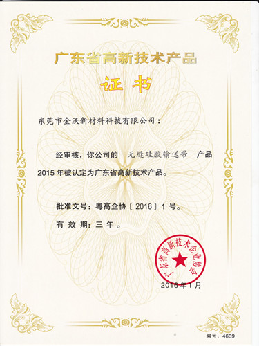 祝贺东莞市金沃新材料科技有限公司的专利产品《无缝硅胶输送带》荣获广东省高新技术产品奖!